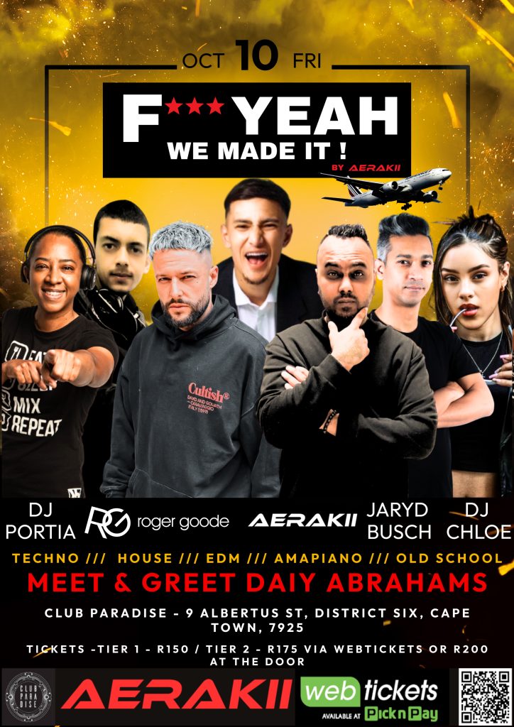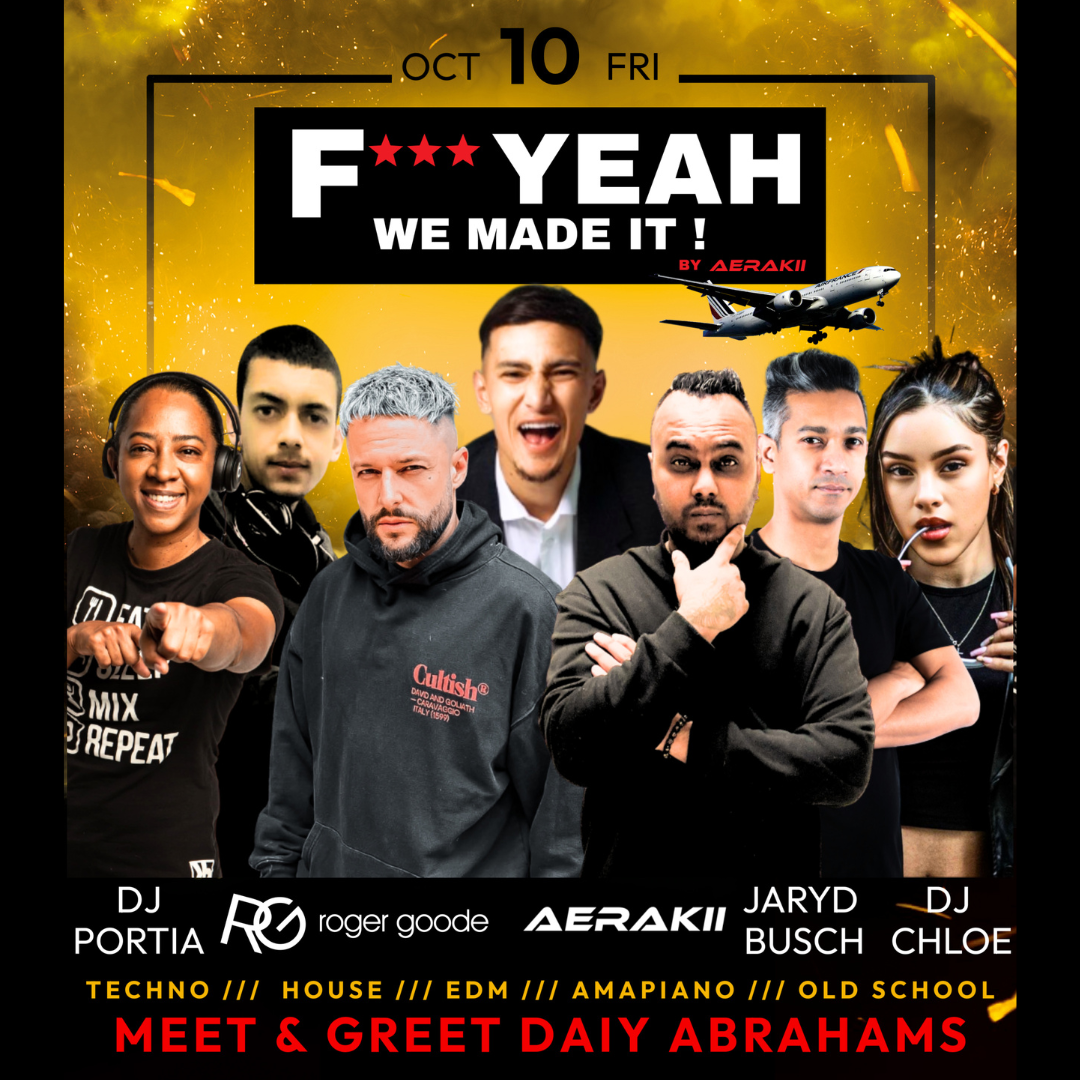 F* Yeah, We Made It** (founded by Aerakii) is a next-gen event platform and nightlife experience born in Cape Town. We’re all about celebrating music culture in all its forms — from EDM and house, to Amapiano, Hip-Hop, Afro-tech, and beyond. Our mission is to spotlight unforgettable lineups, unique venues, and the raw energy that brings people together on the dancefloor. Whether it’s a headline set from a festival legend or an underground takeover by fresh local talent, we curate moments that move you.